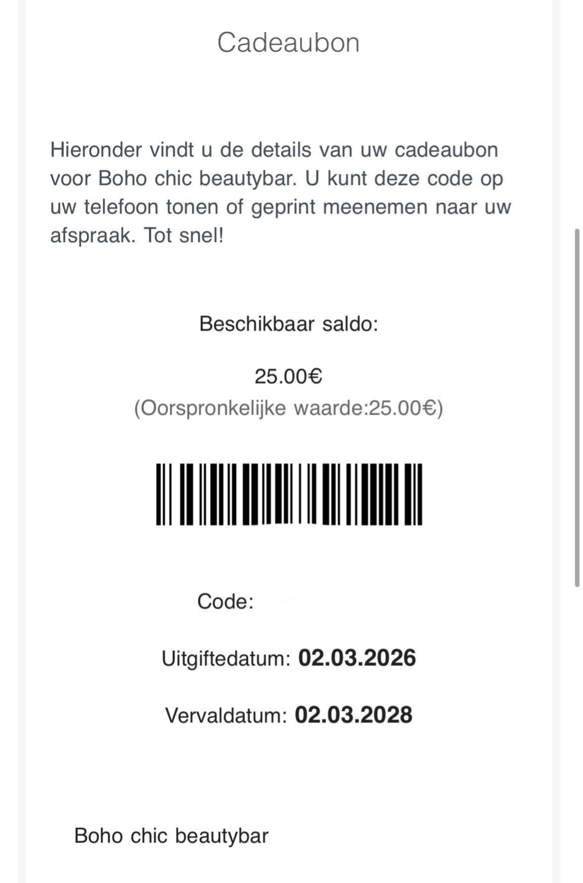 Je kunt nu dus ook een cadeaubon kopen! Dat is natuurlijk mega handig maar wat kun je verwachten? Je kunt mij een berichtje sturen zodat ik de tegoedbon kan aanmaken, geef het emailadres door van de ontvanger en dan krijgt de ontvanger onderstaande mail met unieke code. Bij het maken van de afspraak kun je gelijk de code invoeren en wordt deze ingewisseld. Super snel en simpel toch?